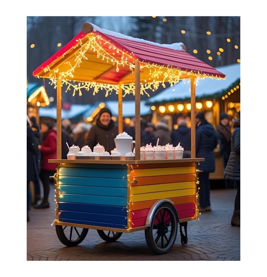 Bring warmth and festive cheer to your event with our Hot Chocolate Cart Hire. Served from our colourful wooden cart, it can be used indoors or outdoors, making it perfect for Christmas parties, Halloween parties, Bonfire Night, outdoor events, exhibitions, and corporate gatherings.